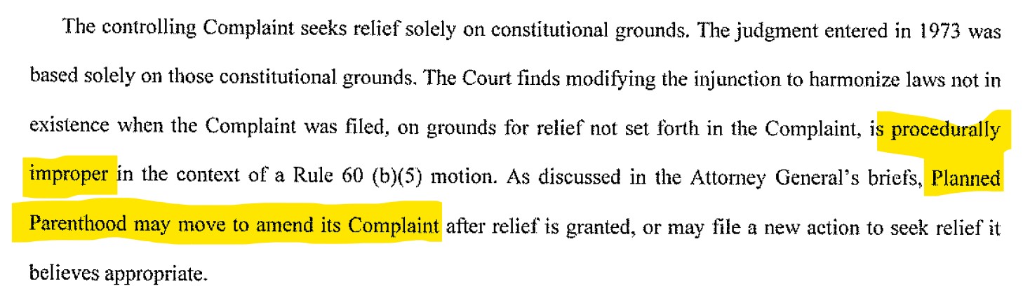 Judge Johnson decided the procedural process did not allow her to do that analysis, and she invited Planned Parenthood to now amend their original 1973 Complaint and ask for a new injunction.